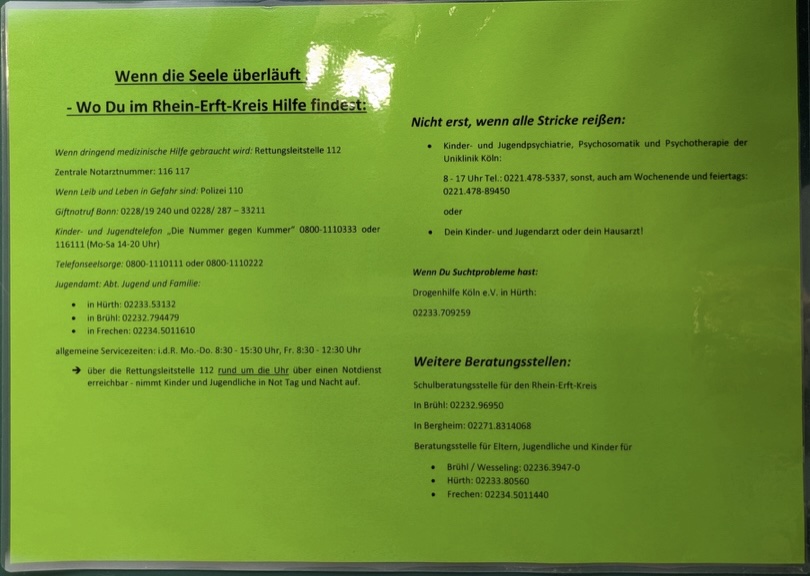 „Diese zwei Tage haben uns gezeigt, wie wichtig es ist sich mit psychischen Erkrankungen und Stressbewältigung auseinanderzusetzen", so Marlene aus der Klasse 10c. Also, wenn ihr euch bedrückt, fühlt: wendet euch an eine Person eures Vertrauens und sucht euch Hilfe beispielsweise bei einer der angegebenen Anlaufstellen des Rhein-Erft-Kreises (siehe Foto).